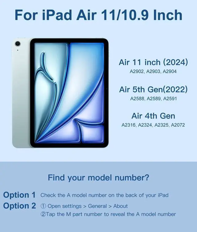 [(Perfect Compatibility)] Specially designed Compatible with iPad Air 11-inch (M3) 2025 (Model Number: A3266/A3267/A3270), for iPad Air 11-inch (M2) 2024 (A2902/AA2903/A2904), for Air 5th Generation 2022 (A2588/A2589/A2591), for Air 4th Generation 2020 (A2316/A2324/A2325/A2072), this keyboard case offers precise cutouts for all ports, buttons, and cameras, seamless access to all features without removing it. Please find the No. "AXXXX" of your tablet before order(Open settings > General > About, Tap the M part number to reveal the A model number)