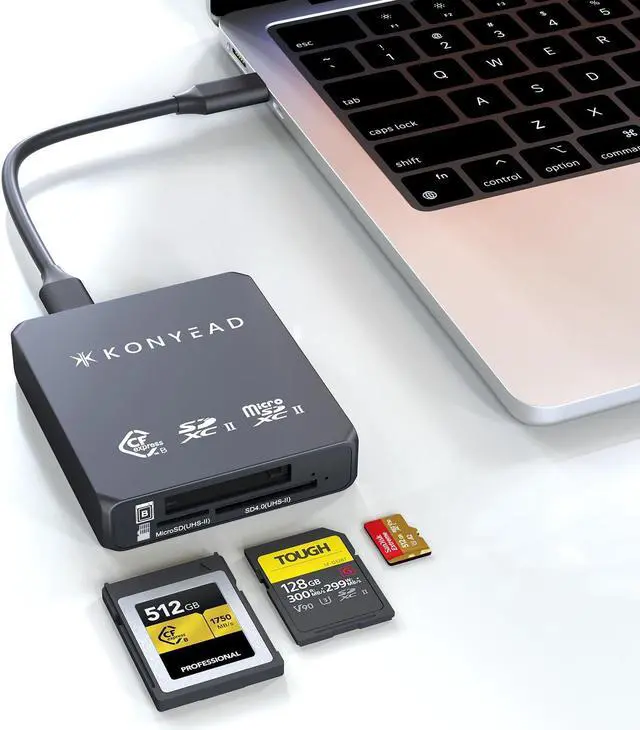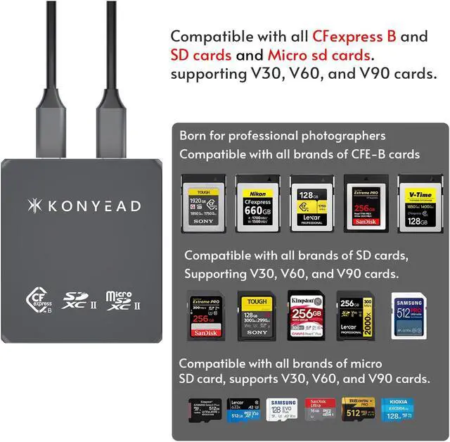 KONYEAD CFexpress Type B & SD & Micro SD 3-in-1 Card Reader, Designed for iPhone/iPad OTG Adapter, Auxiliary Power Supply, USB 3.2 Gen 2 10Gbps, UHS-II, for iOS/Windows/Mac OS/Android (9332B)