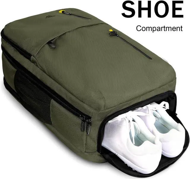 SHOE COMPARTMENT: The shoe compartment is crafted to bottom of the extra large carry on backpack to keep the shoes seperately and everything else neatly. This shoe storage is wide enough to hold size 10-12 for both lady shoes and man shoes which can also be used as toiletries bags and for other uses; There is two venting hole in shoe compartment, make it keep breathable