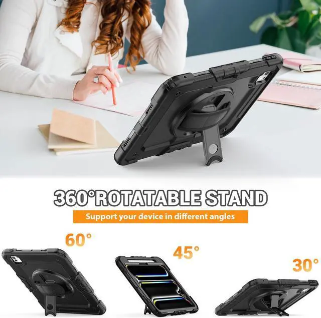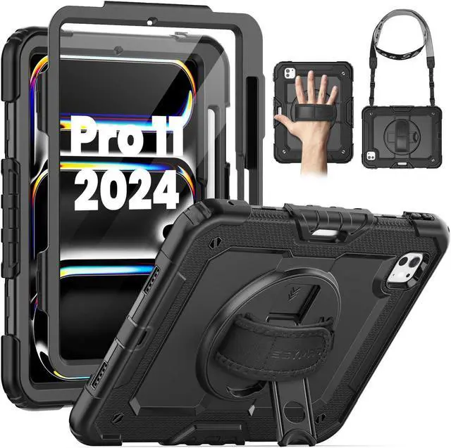 SEYMAC for iPad Pro 11 Inch Case 2024 (M4), Heavy Duty Shockproof Protective Case with Screen Protector, 360deg Rotating Stand, Hand/Shoulder Strap and Pen Holder for iPad Pro 11 2024, Black