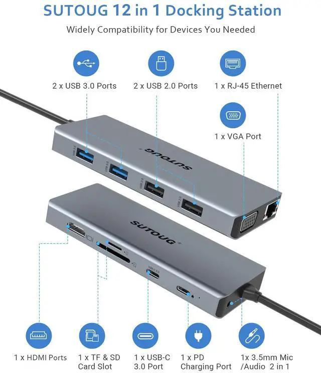 USB C Hub, SUTOUG 12 in 1 Docking Station with 4K HDMI & 1080P VGA, 92W PD, 1Gbps Ethernet, USB-C 3.0 & 4 USB-A Data Ports, SD TF Card Reader, USB C Adapter for Surface Pro MacBook Pro Air & Windows