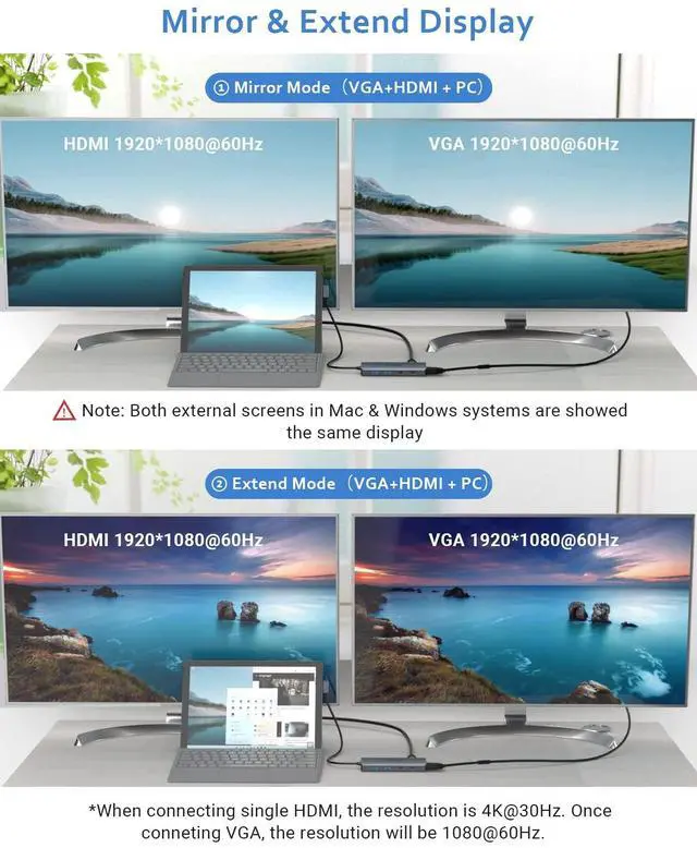 12 in 1 Multifunctional Hub - Our USB C hub with dual display, which is portable, highly practical and powerful. It is more convenient than the traditional bulky docking station which can realize multi-screen display, (mirror mode/extended mode) helps you easily understand the new concept of USB C HUB. Note: Before using this product, please make sure the host USB-C port on your device must support DisplayPort Alt Mode and Power Delivery.