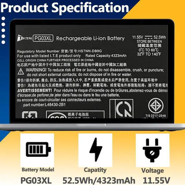 PG03XL 52.5W h Battery Replacement for HP Pavilion Gaming 15-DK 15-EC 16-A0032DX 16-A0035NR 15-EC0013DX 15-EC1073DX 15-DK0055NR 15-DK0125TX OMEN 5X FPC52 L48495-005 HSTNN-DB9G L48430-AC1 11.55V 4323mAh