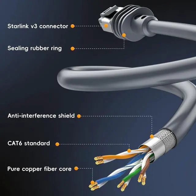 Upgrade your Starlink internet setup with this RJ45 to RJ45 Starlink cable designed specifically for the Starlink Gen 3 and Mini models. This waterproof Ethernet cable serves as a reliable replacement for the standard V3 cable, ensuring a stable and secure connection for your satellite internet. Crafted with a 26AWG CAT6 standard, this cable offers superior performance and durability. Whether you need to extend your network or replace a damaged cable, this Starlink cable is an essential accessory for seamless internet connectivity. With its weather-resistant construction, you can trust it to withstand harsh outdoor conditions.