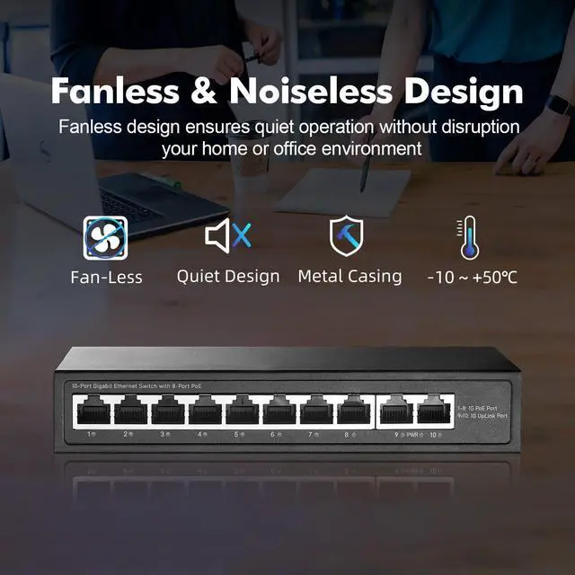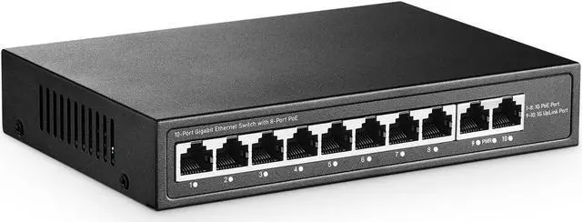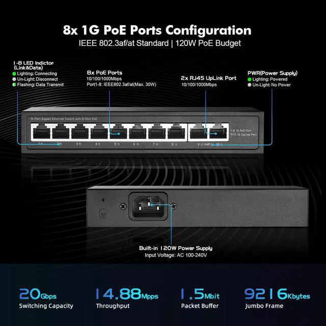 [(IEEE 802.3af/at PoE)] Ports 1-8 support ieee802.3af/at PoE, max 30w; Built in power supply, 120W overall, POE port output voltage 44-57V, typical value 48V.Compatible with non-POE devices to provide network. *Please note: it will not supply power to passive 24V PoE and NON-PoE devices.*