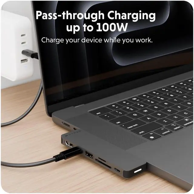 100W Power Delivery Pass-Through Charging: Charge your device up to 85W with a 100W Power Delivery 3.0 charger while using the HyperDrive USB C Hub -- perfect for uninterrupted performance.
