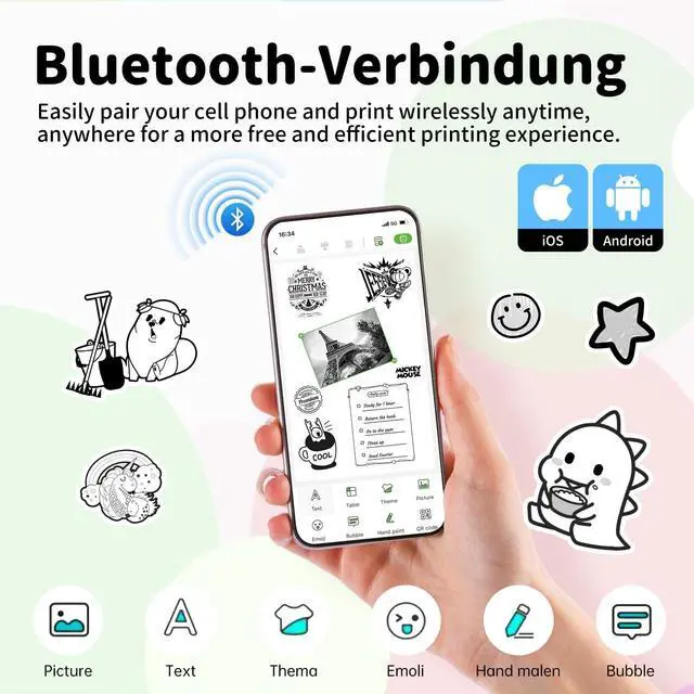 • Portable & Compact Design: Our mini thermal sticker printer is a compact and portable wireless printers, perfect for students, professionals, and DIY lovers. Easily carry this small wireless printer in your bag or pocket to print study notes, labels, or to-do lists anytime, anywhere. With bluetooth printer for iPhone and Android compatibility, its your ideal portable sticker maker