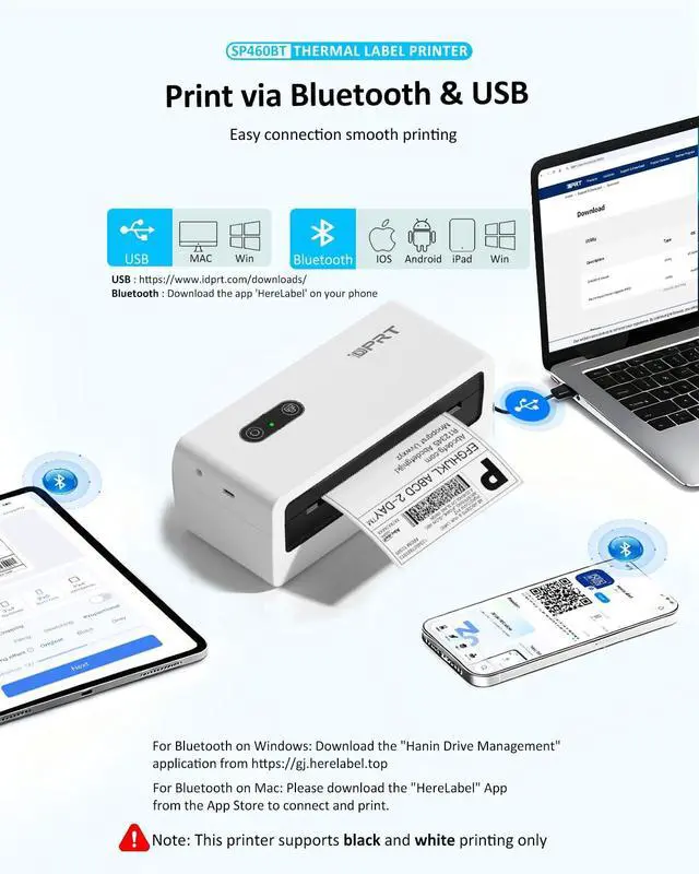 Bluetooth Thermal Label PrinterThe SP460BT Bluetooth thermal shipping label printer supports both Bluetooth and USB connections, making setup flexible and easy. Connect to Windows, macOS, and ChromeOS via USB, or to iOS and Android through Bluetooth using the 'HereLabel' App.