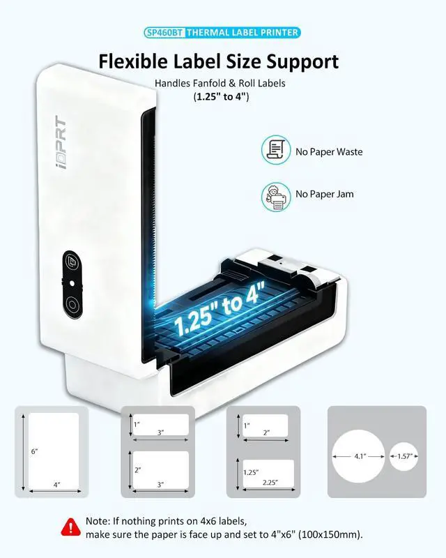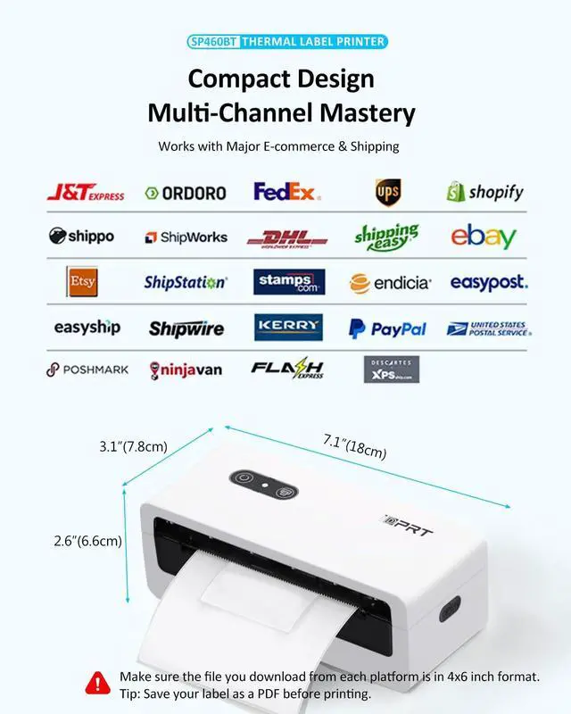 (Note: Only supports thermal paper, Not work with regular standards paper!! Only Print in Black! ) ^^ Smart & Cost-Saving Label MakerThe impresora termica advanced direct thermal technology, requiring NO ink or toner. With 203 DPI resolution, every label is sharp and easy to scan. This shipping label printer automatically aligns labels to prevent paper waste simple, clean, and economical for long-term use. ^^ Bluetooth Thermal Label Printer for Small BusinessUnlike other shipping label printers that chase extreme speed, the SP460BT Bluetooth thermal label printer is designed for stability, precision, and dependable performance. With a steady 100mm/s printing speed, this thermal shipping label printer ensures every 4x6 label is printed clearly and accurately perfect for small businesses that value quality, reliability, and smooth label printing over sheer speed. ^^ Easy Setup & Reliable SupportThe desktop label printer is easy to install ready to print in just one minute. Each package includes the printer, USB drive, user manual, and 50 sheets labels. We offer a 1-year warranty and professional customer support via email, phone, or remote assistance.