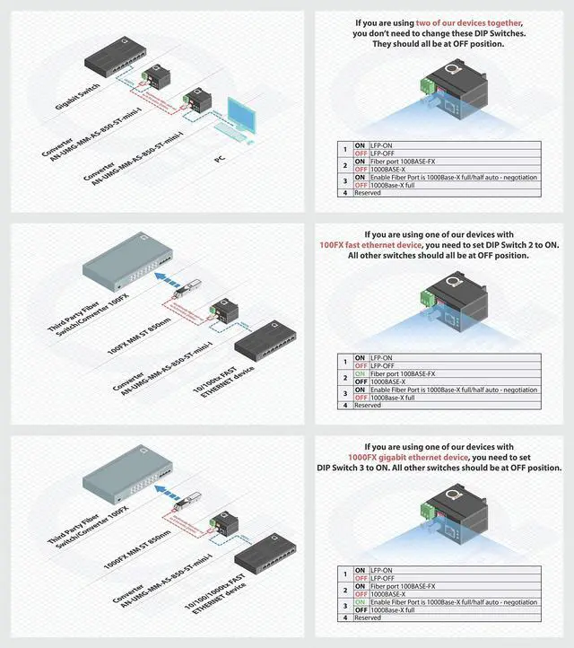 Fiber Transmission Wavelenght: 850nm Fiber Port Datarate - 1000SX or 100SX (easy to set by dip switch) Status LED indicators for Power, Link/Activity, Full-Duplex, and