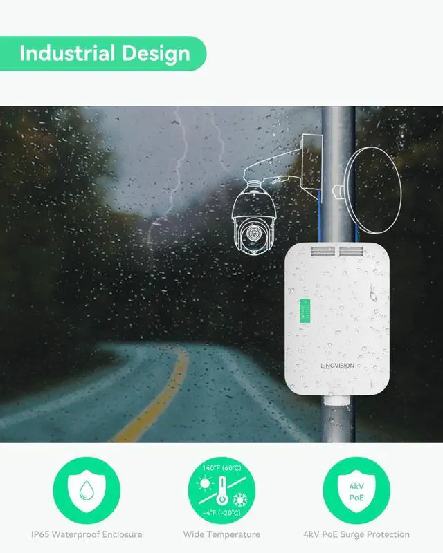 OUTDOOR PoE SWITCH: IP65 Waterproof Enclosure and 4kV Surge Protection ensure your devices operating safely outdoor. It is suitable for harsh working environments from -4 to 140 or -20 to 60