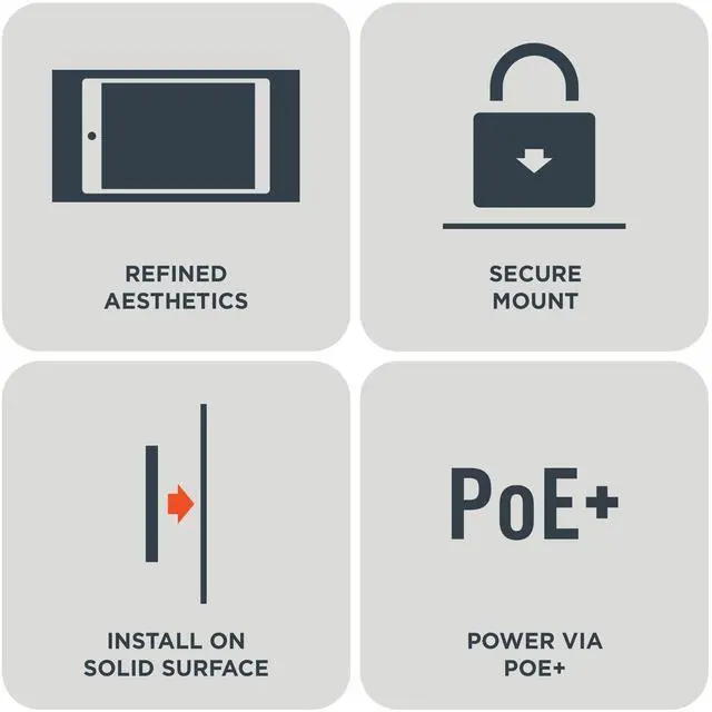 Minimalist design for a modern look Features a low-profile, precision-machined aluminum frame that blends seamlessly into residential or commercial environments. ^^ Continuous charging with included PoE+ adapter Keeps your iPad powered at all times using the included Power over Ethernet Plus (PoE+) adapter and USB-C cable, reducing downtime and eliminating visible cords. ^^ Secure installation with built-in locking feature Helps protect your device from unauthorized removal by allowing you to lock the iPad securely into the mount. ^^ Easy wall mounting on solid surfaces Designed for permanent installation on drywall or other solid surfaces, creating a stable and flush iPad wall setup.
