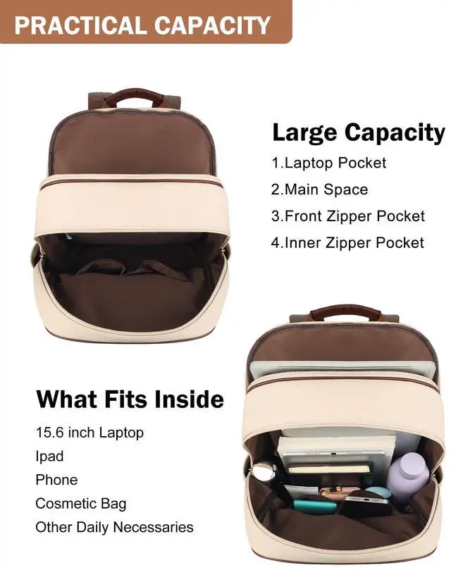MASINTOR 15.6 inch Leather Laptop Backpack Purse for Women, Designer Travel and Work Bag with Laptop Compartment Beige Brown