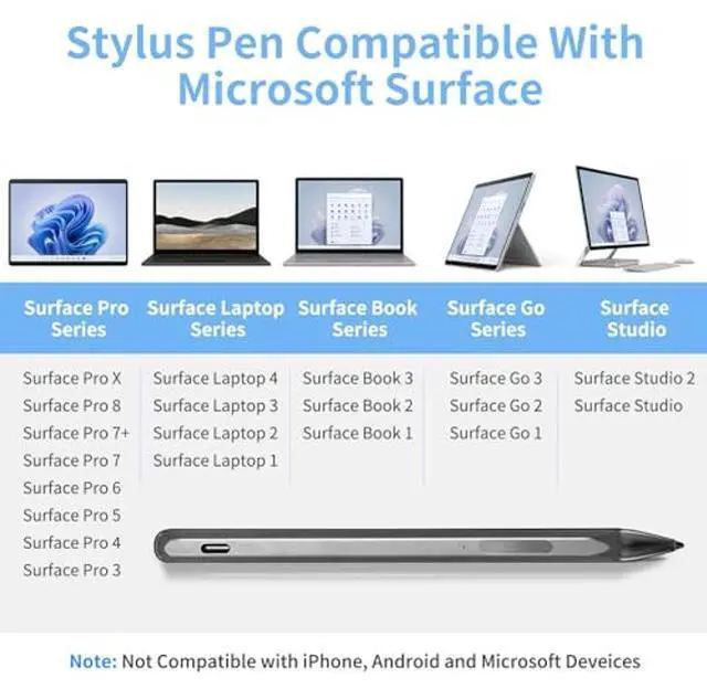 • [(Compatible Models)] This stylus compatible with Microsoft Surface Pro X/Pro 9/Pro 8/Pro 7+/Pro 7/Pro 6/Pro (5th Gen)/Pro 4/Pro 3, Surface Book/Book 2/Book 3/Book 4, Surface Go/Go 2/Go 3, Surface Laptop/Laptop 2/Laptop 3/Laptop 4/Laptop Studio, Surface Studio/Studio 2 and Surface 3.