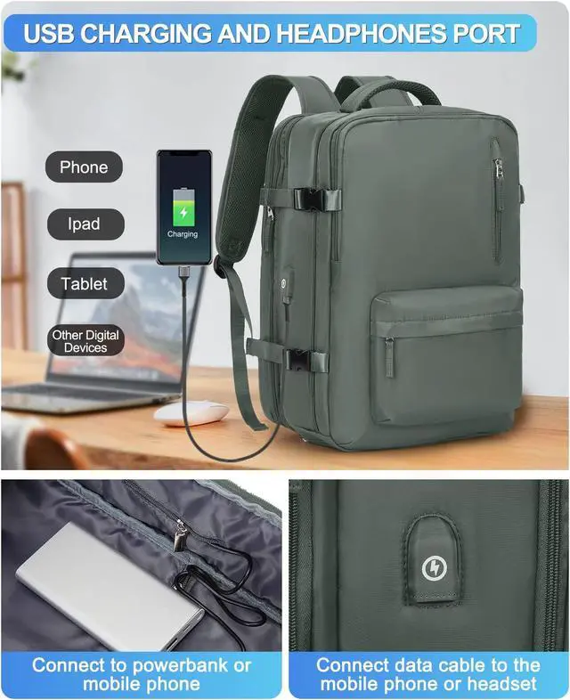 VGCUB Large Travel Backpack Bag for Women Men,Carry on Backpack,17 Inch Laptop Business Work Waterproof Backpack with Laptop Compartment,Person Item Flight Approved,Mochila de Viaje,Green Expandable