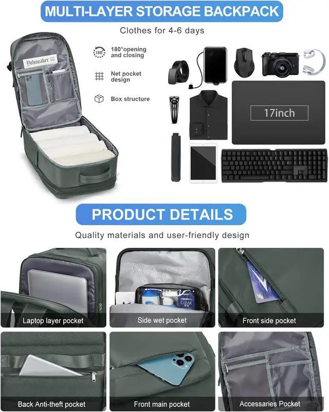 [(Multi-pocket Backpack)] The travel backpack with many compartments holds about 45L. The main pocket can hold goods, and fit 5-8pcs of clothes. The front compartment with various pockets can be used to store notebooks, pens, earphones, and other small items, for quick pick out. The travel bag has a built-in laptop compartment that fits most 15.6-inch laptops.
