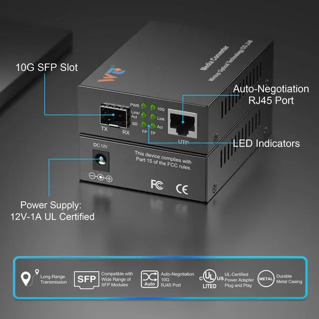10G Fiber Ethernet Media Converter, WTSFOPTC Fiber Optic Transceiver, 10G SFP to RJ45 Media Converter