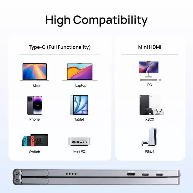 ^^ Wide Device Compatibility: Seamlessly works with Laptop/Mac/PC/Windows systems, also perfectly matches gaming devices like PS5/Xbox. A multi-scene dual screen extender for home office, remote work, travel, gaming and outdoor scenarios.