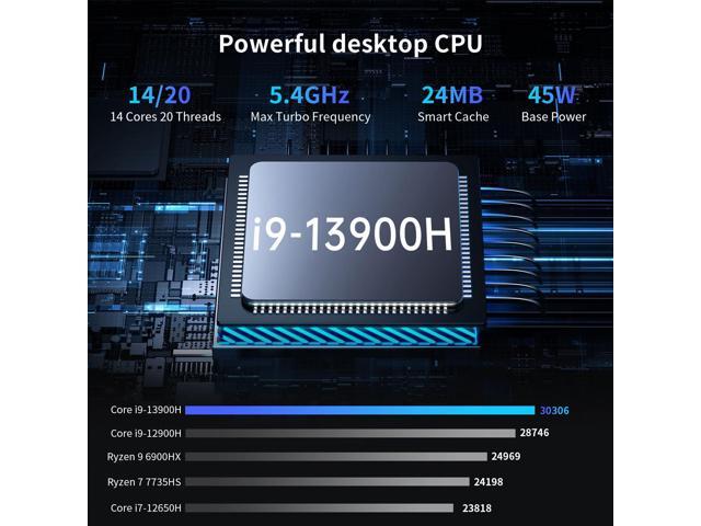 - [High Performance] Mini PC equipped with Core i9-13900H processor, 14 cores 20 threads, 24M smart Cache, Max Turbo Frequency: 5.4GHz. This mini-computer is Pre-installed with Windows 11 Pro (64bit) OS, Built-in Intel AX210 WiFi6E, Bluetooth 5.3, Compared to wifi6, the 6GHz band has been added for better anti-interference capability and faster transmission rate. Mini PC is ideal for such as Home Entertainment, Design, Office, Online Education, Industry, etc.