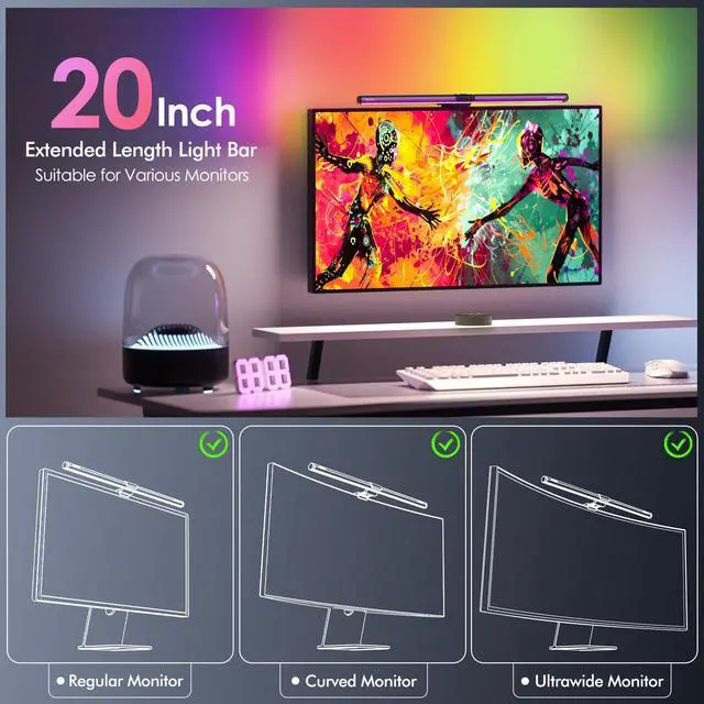 Design for Larger Monitor: Quntis ScreenLinear RGB Pro+ is crafted from elegant light-grey aluminum alloy, this sleek design can bring sophistication to space. The 20-inch light bar length is perfect for large screens. The patented sliding weighted clip allows easy installation above any monitor, saving your precious desk space. Our multi-functional touch remote-controlled allows you to operate it all on the desktop, no need to worry about the lamp bar loosening due to frequent touching