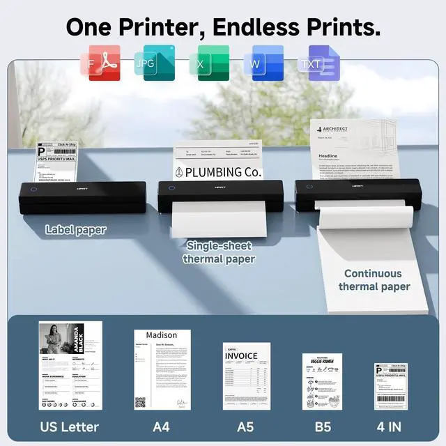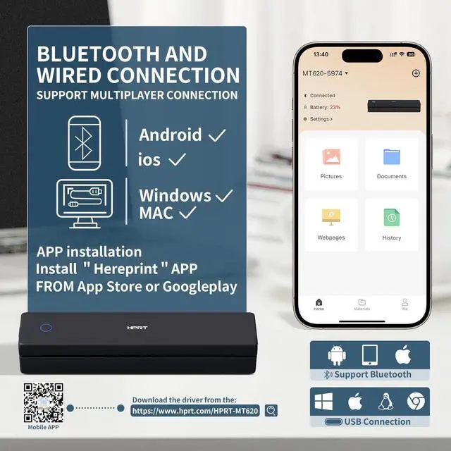 HPRT Inkless Portable Printer Wireless for Travel,Thermal Printer Supports 8.5" x 11" US Letter&A4&A5,Compatible with iOS,Android, Laptop, MT620,203 DPI,Black