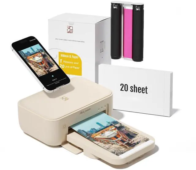 High Printing Efficiency - HPRT photo printer (Beige) comes with printer consumables and Wifi-connection printing technology, combined with simple structure and easy assembly design to offering true portability and flexibility and also make your photo printing faster and convenient ^^ Excellent Printing Experience - Thermal dye sublimation and automatic lamination technology brings vivid picture and also protect your photo from dust, fingerprint and water, which can captures every nuance and the clarity, sharpness, and vividness of the images are awe-inspiring ^^ Ideal Desktop Photo Printer - Lightweight machine with high photo resolution ( 300DPI), Plug and play and so easy to use, which is perfect for daily use or work at home.