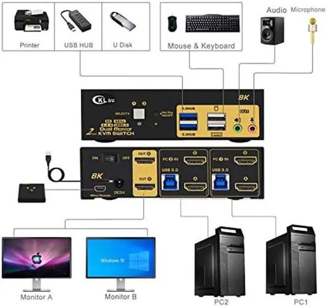 • 2. 8K Dual Monitor KVM Switch USB 3.0: We are certified HDMI adopter over 10 years. Excellent image processing and transmission capacity, make the output signal is more smooth and steady. Drive-free for Windows 10/7/2000/XP/Vista, Linux, Mac, Debian, Ubuntu, Fedora, Raspbian, Ubuntu, etc.