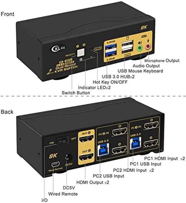 • 1. KVM Switch Dual Monitor HDMI: 2 computers/laptops sharing one set of keyboard & mouse, 2 monitors, audio, microphone and 2 pcs USB 3.0 peripheral devices. Support HDMI 2.1, HDCP 2.2, HDR 10. (Tips: 1. This KVM switch required each of your computers with 2 video output. 2. This KVM switch without EDID emulation, windows size and location maybe moving after switching.)