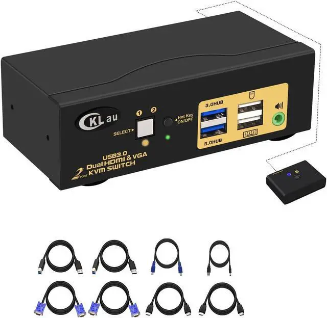 CKLau 4Kx2K@60Hz 4:4: 4 2 Port USB 3.0 Dual Monitor KVM Switch HDMI + VGA with Audio and Cables, HDMI VGA KVM Switch 2 Monitors 2 Computers Support Wireless Keyboard Mouse
