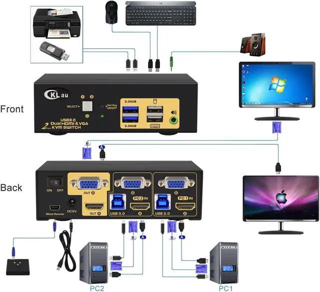1. 2 Monitor KVM USB 3.0 Switch: 2 HDMI+VGA computers/laptops sharing one set of keyboard, mouse, 2 monitors, and 2 USB 3.0 peripheral devices. With 2 USB 3.0 HUB, the data transferring rate is up to 5Gbps/s (10 times faster than USB 2.0). (Tips: This KVM switch requires each of your computers with 2 video outputs, it is better with a VGA port and an HDMI port. Otherwise only 1 monitor have display.)