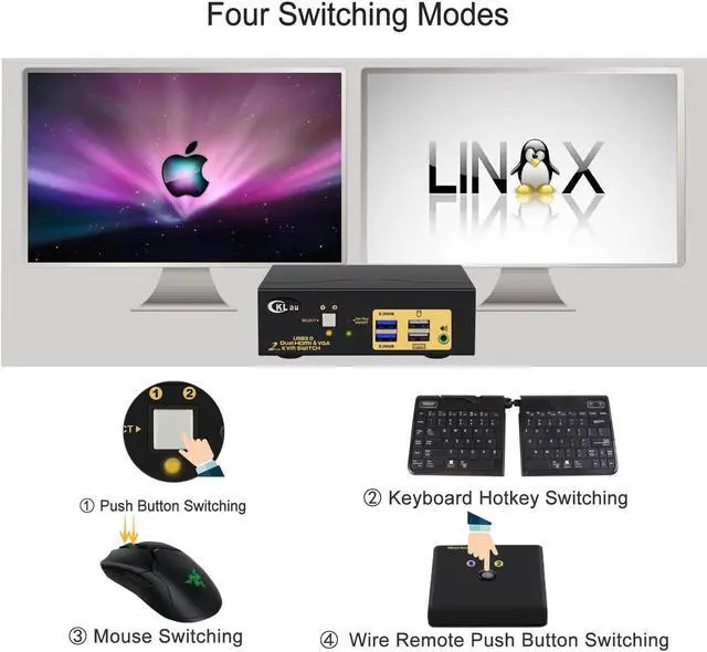 3. USB 3.0 KVM Switch VGA: Four switching way optional: Hotkey switching(Num Lock + Num Lock + 1 / 2 + Enter, or Ctrl + Ctrl + 1 / 2 + Enter, or Scroll Lock+ Scroll Lock+1 / 2 + Enter), mouse switching(click mouse wheel 2 times), manual