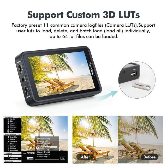 ^^ 4K HDMI Support Maximum support up to 4K UHD 3840X2160p (24//25/30Hz), 4096X2160p (24Hz). It can directly connect to DSLR camera or camcorder and receive 4K HDMI signals without delays, sending it to another monitor at the same time, convenient for directors and photographers to monitor simultaneously. Audio can be monitored in real time via the 3.5 mm headphone jack. ^^ 3D LUT Support3D LUTs enable you to create a specific look for your shooting, from a simple colour correction to something more original and transformative. And with the USB drive included, you have the freedom to apply your own 3D LUT files in-monitor, using the Look File function.