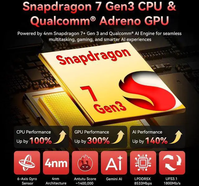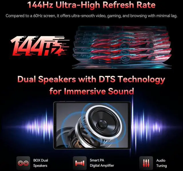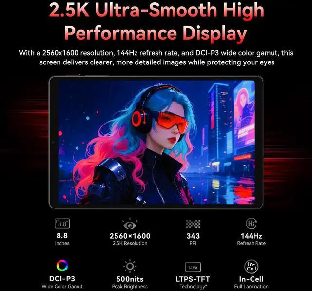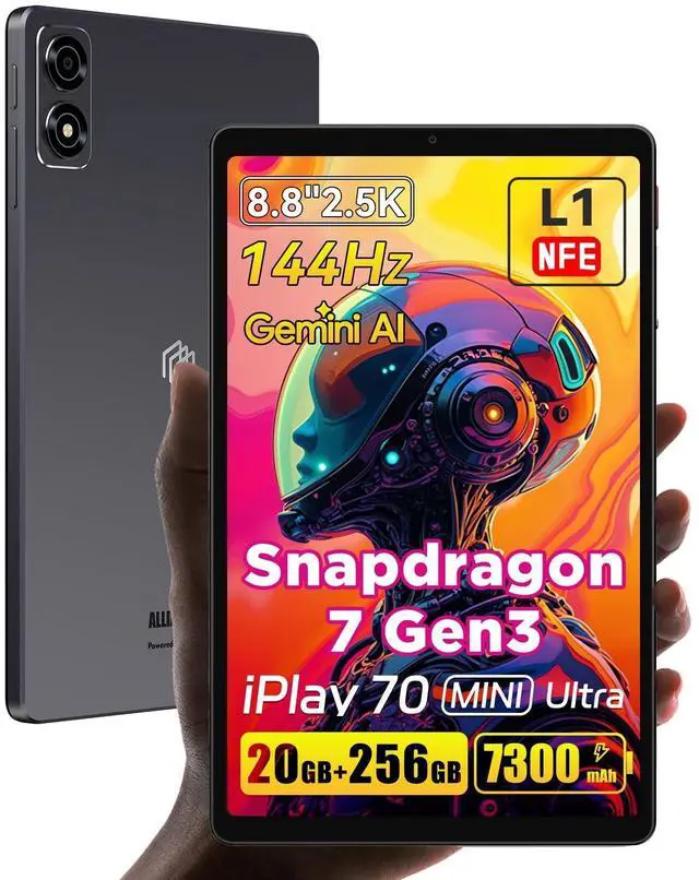 Snapdragon 7+ Gen3 CPU + Adreno 732 GPUThe iPlay 70 mini Ultra 8.8 -inch tablet is powered by the Snapdragon 7+ Gen3 processor (4nm), delivering exceptional performance with an AnTuTu score of 1.4 million points 2.7 x higher than the Dimensity 7050. The Adreno 732 GPU enhances 3D game rendering by up to 1.8 x, ensuring smooth performance at high graphics settings. With LPDDR5X RAM and UFS 3.1 storage, data transfer speeds reach 8533Mbps, app startup speeds increase by 1.4 x, and file transfers are 2.1 x faster. Video editing is 37% faster, significantly improving multitasking and overall work efficiency ^^ 144Hz Refresh Rate + 2560x1600 Resolution (500nits) + Dual DTS SpeakersThe 8.8" IPS LCD with 144Hz refresh rate offers smooth scrolling and gaming.