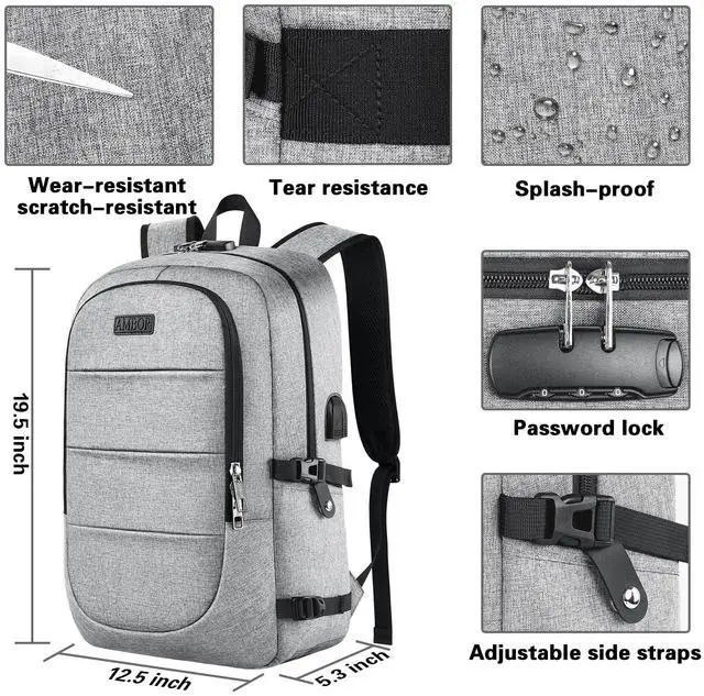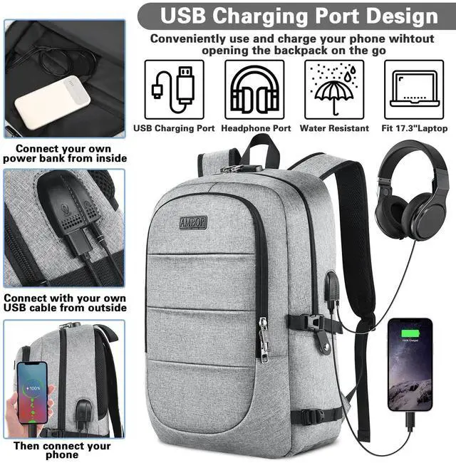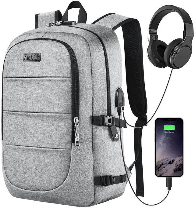 AMBOR Travel Laptop Backpack, 15.6-17.3 inch Anti Theft Business Laptop Backpack with USB Charging Port and Headphone Interface, Backpack for Men & Women, Grey
