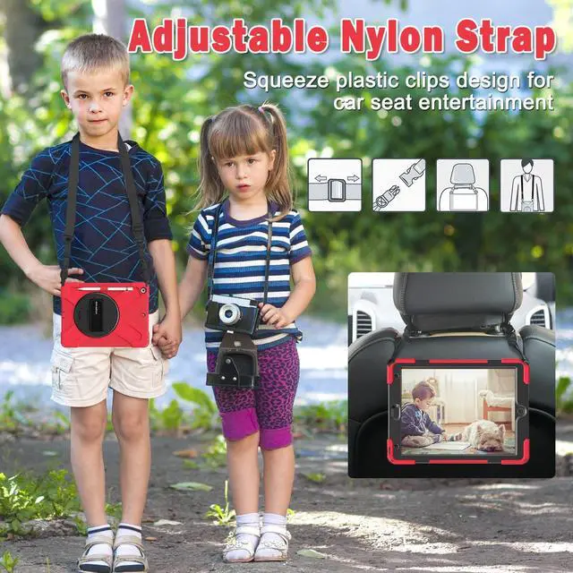 BRAECN iPad 9th 8th 7th Gen 10.2 Case 2021 2020 2019, Rugged Heavy Duty Case with Screen Protector Pencil Holder Pencil Cap Holder Hand Strap Shoulder Strap Kickstand for Apple iPad 9/8/7 10.2" -Red