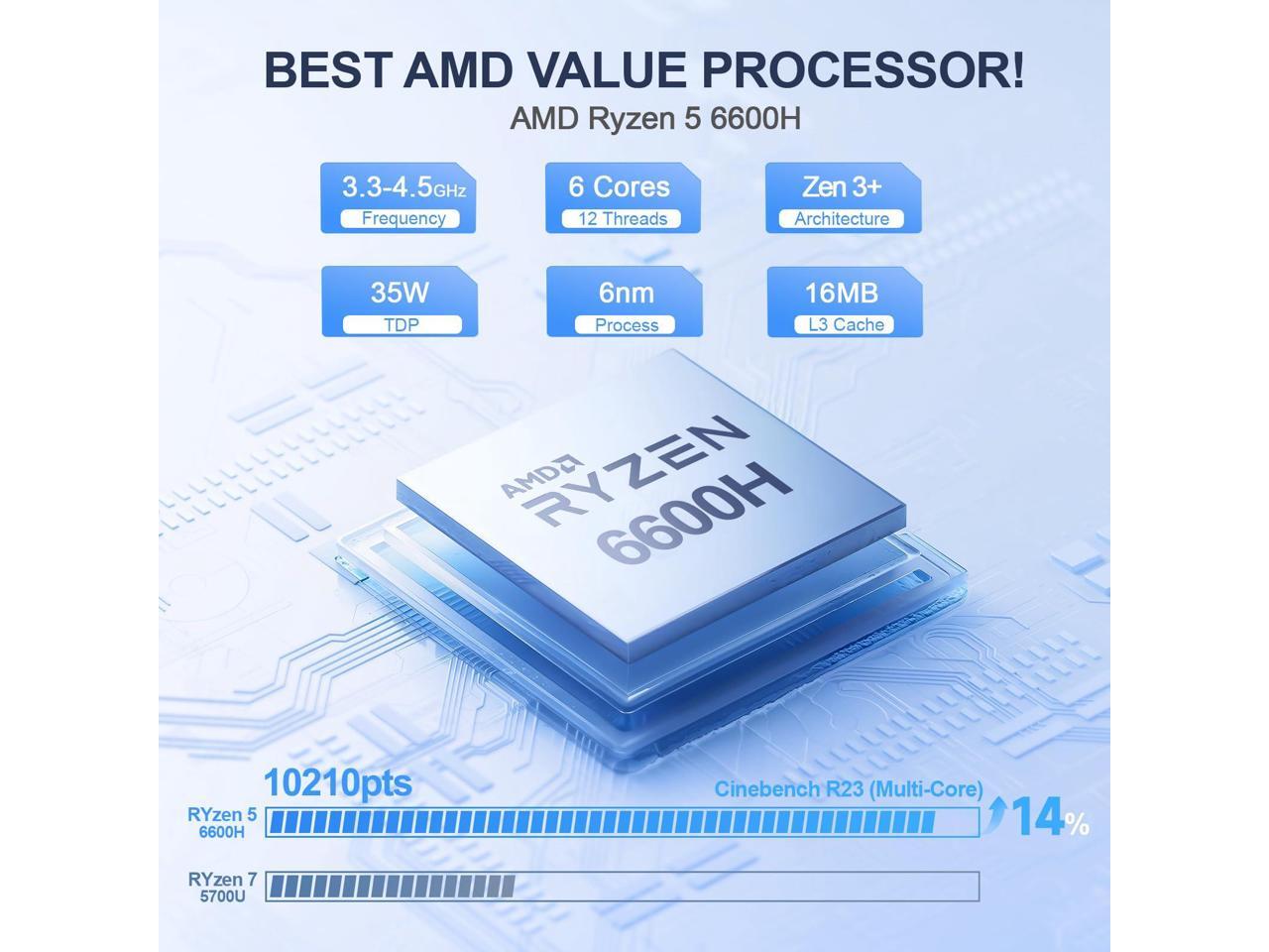 - AMD Ryzen 5 6600H: This Beelink Mini PC is equipped with AMD Ryzen 5 6600H (6 cores 12 threads, 3.3 GHz - 4.5 GHz, 16M L3 Cache). The performance of 6600H mini pc is improved by 24% compared to 5560U. This mini computer is integrated with an AMD Radeon 660M 6 core 1900 MHz graphics, ideal for office work, editing high-resolution videos and images, multimedia playback with KODI or IPTV up to 4K and light gaming