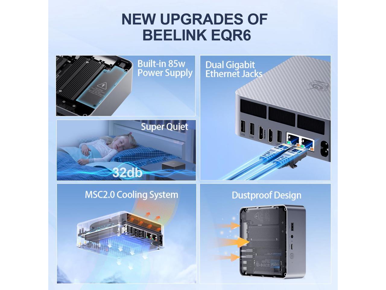 - New Breakthrough Designs: Beelink EQR6 mini pc is built in with 85W power supply, simplify your space with less cable clutter. The MSC2.0 cooling system brings stronger heat dissipation and help the AMD mini pc runs smoother and quieter. The dust filter prevents dust accumulation inside the small pc, making cleaning the EQR6 less cumbersome and ensuring trouble-free operation