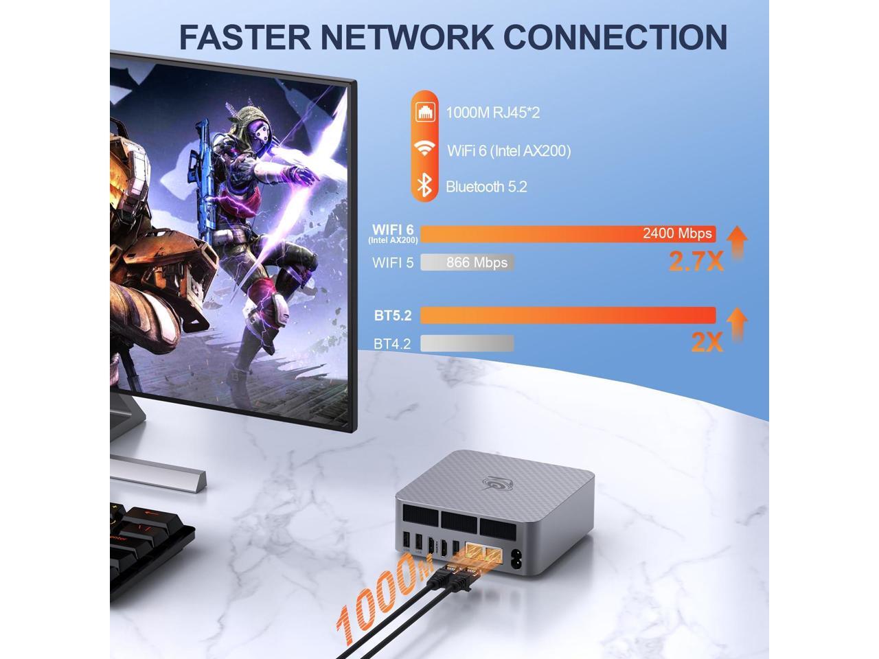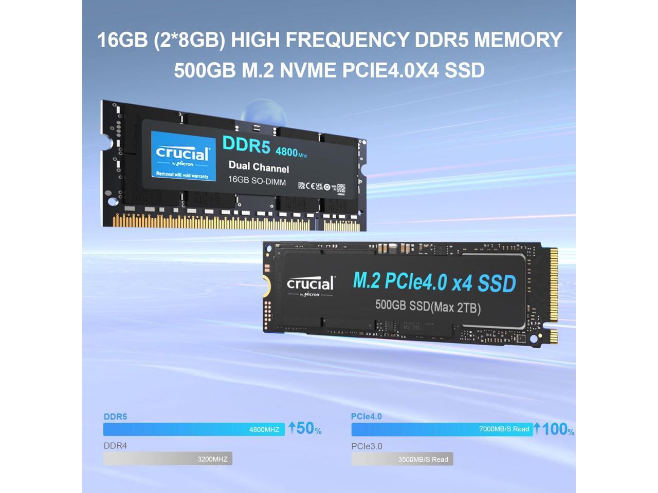 - 16GB DDR5 & 500GB PCIe4.0 SSD: EQR6 mini pc comes with 16GB DDR5-4800MHz RAM (8GB * 2, dual-channel, expandable up to 64GB) and 500GB M.2 2280 PCIe4.0x4 SSD (two SSD slots, max 4TB * 2, speed