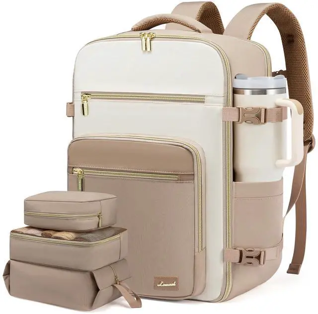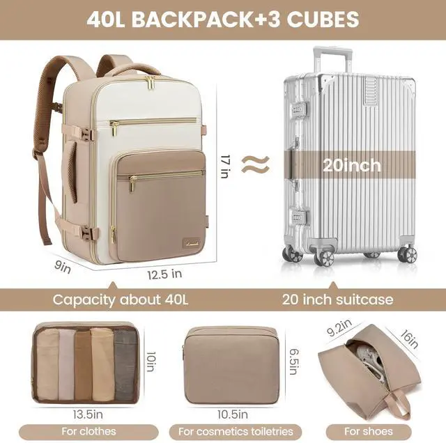 LOVEVOOK Travel Backpack For Women,40L Carry On Backpack Flight Approved,TSA Personal Item Travel Bag Fits 17 Inch Laptop,Weekender Overnight Daypack with Toiletry Bag and Cube,White Light-brown