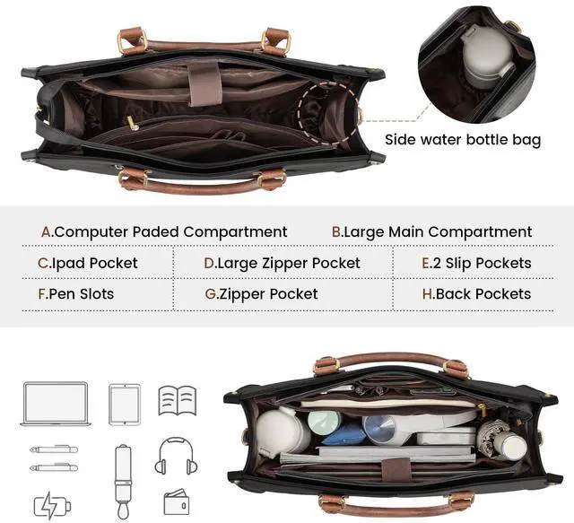 MULTI-POCKET LAPTOP BAG The leather tote bag features 1 main computer padded compartment, 1 tablet compartment, 1 large zipper pocket, 2 slip pockets, 2 pen slots, 1 external wall zipper pocket, and 1 back zipper pocket. Plus, some details combine security with ease of use. Thick foam padding inside the computer compartment, allows this women's laptop bag to better protect your laptop