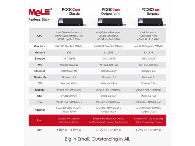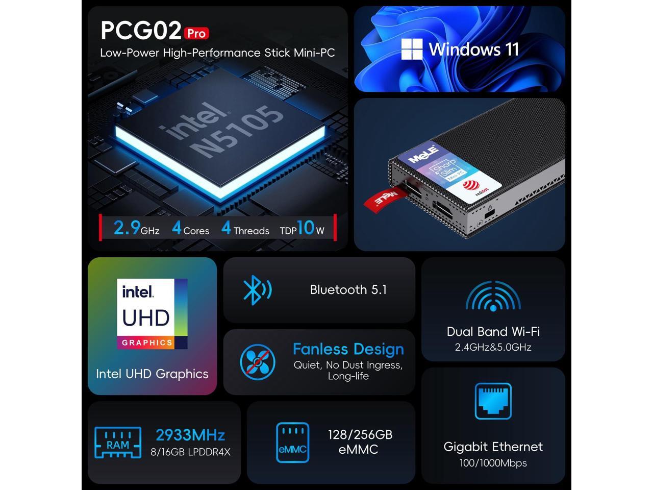 MeLE Fanless Mini PC Stick PCG02 Pro N5105 8GB/256GB with Windows 11 Pro, WiFi5 USB PD3.0, Micro Computer Desktop Dual HDMI, Gigabit Ethernet BT5.1, Compact SFF on Business Office Industrial IoT Home
