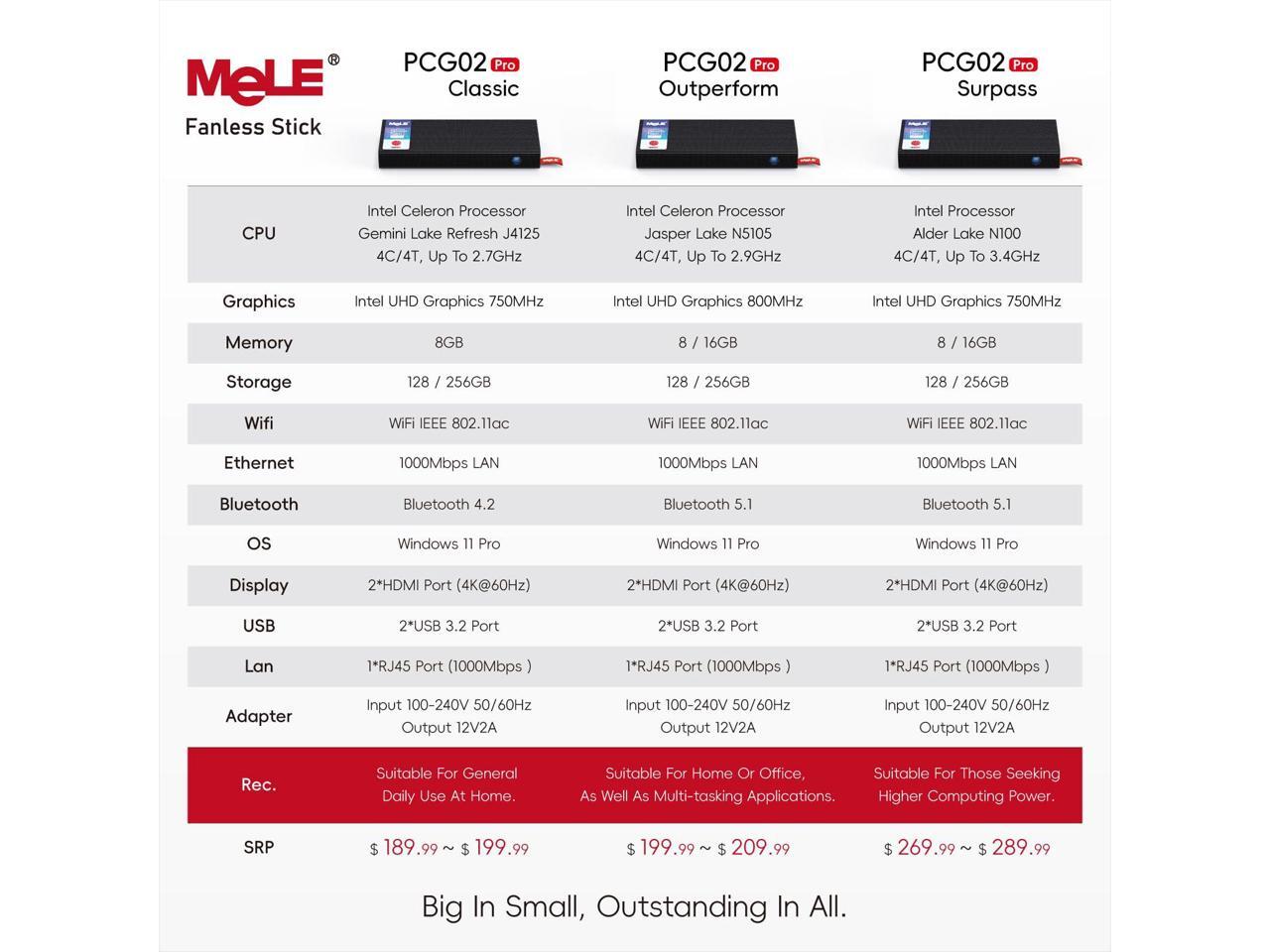 - [(8GB RAM and 256B Storage )] - The PCG02 Pro hdmi stick pc equipped with 8GB of 2933MHz DDR4 RAM, 256GB stable eMMC, with a Micro SD port support expanding up to 2TB( This N5105 model is not support SSD expansion due to the limited PCB space)