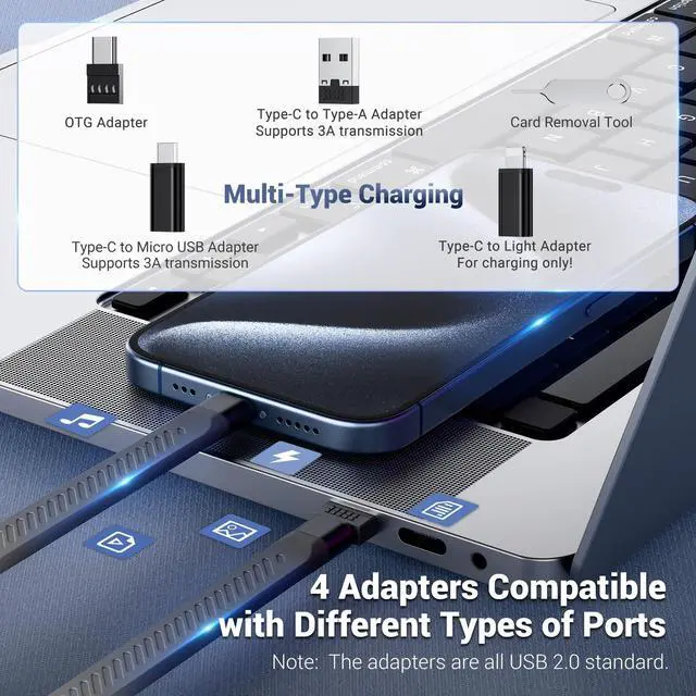 ^^ 4-in-1 Multi-Function Cable: The card reader includes a Type-C cable with four different adapters (USB-A/ Micro USB/Light/OTG), expanding the compatibility to connect various devices on the go. Say goodbye to carry multiple data cables.