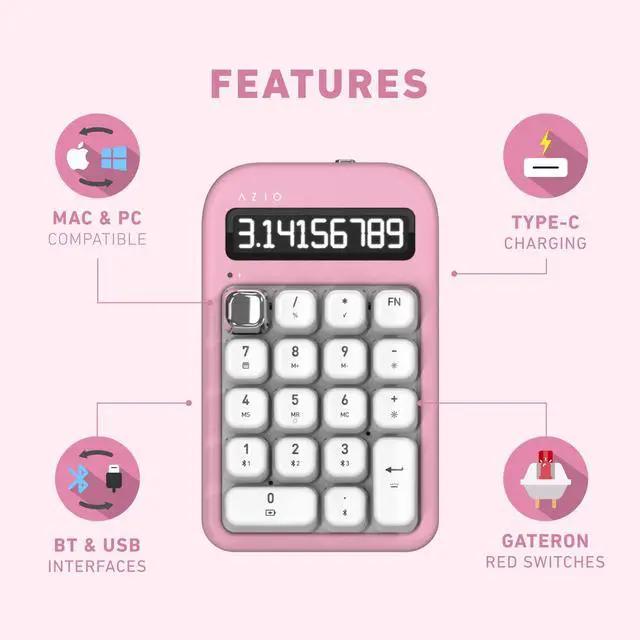 AZIO IZO Wireless Mechanical Calculator & Number Pad (Pink/Silver) - Bluetooth 5.0 & USB, Gateron-Red Mechanical Switch, 9 Backlight Modes, Rechargeable, PC & Mac Compatible, Pink Blossom (IN408)