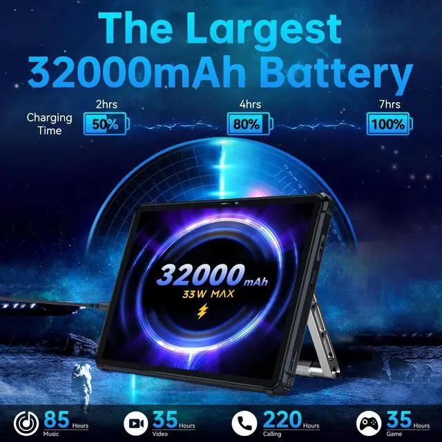 5G Rugged Tablet&32000mAh Ultra-large Battery&33W Fast ChargingOUKITEL RT7 rugged android tablet is the world's first 5G Rugged Tablet, which is 20 times faster than 4G. It is equipped with 32000mAh ultra-large battery. Support 180 days standby, 220 hours of continuous calls, 35 hours of online video, 35 hours of games. 33W fast charging function, about 7 hours can be charged 100%. OUKITEL RT7 rugged tablet supports OTG function, you can move the power supply to charge other smart device. ^^ 24GB RAM+256GB ROM&MT6853 Octa cores&Android 13 TabletOUKITEL RT7 Android 13 5g rugged tablet is powered by 7nm process technology and Dimensity720 (MT6853) Octa cores processor for smooth multitasking and gaming.