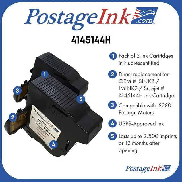 This product is NOT Compatible with iX-1 postage machines. Do not purchase if you have an iX-1 postage machine ^^ Pack of 2 Fluorescent Red Ink Cartridges ^^ Compatible with IS280 and IM280 Postage Meters ^^ USPS-Approved Ink ^^ Lasts up to 2, 500 imprints per cartridge or 12 months after opening ^^ Replacement for OEM # ISINK2 / IMINK2 / Surejet # 4145144H Ink Cartridge
