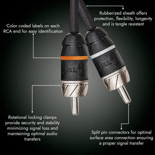 RCA cables are the backbone of any stereo system, as they are used to transfer audio and video signals between devices. With inferior quality cables you are going to get distortions which will impede your system from performing at maximum efficiency, which is why it is necessary to never settle for cheap RCA cables. Elite Audio took all this into consideration when they designed their premium RCA cables. These RCA cables are made with 100% Oxygen Free Copper (OFC) which helps improve conductivity, as well as other advanced technologies like triple shielding, magnetic interference rejection, a woven outer shield, and more.