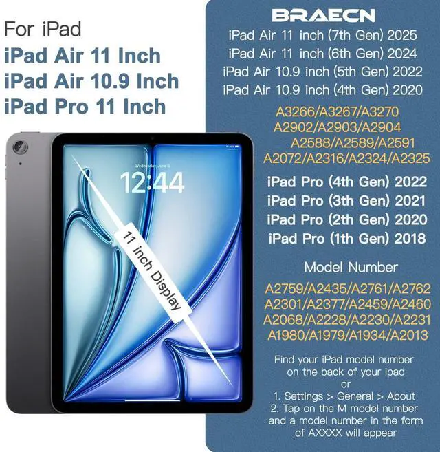 Compatibility:Designed for iPad Air 11 Inch M3 2025&iPad Air 11 Inch M2 2024(Model: A2902/A2903/A2904), iPad Air 10.9 Inch 5th Generation (Model: A2589/A2591)/iPad Air 10.9 Inch 4th Generation (Model: A2072/A2316/A2324 /A2325). Also fit for iPad Pro 11 Inch 4th/3rd/2nd/1st Gen 2022/2021/2020/2018 (Model: A2435/A2759/A1980/A2013/A1934/A1979); NOT compatible with other iPad models. Please confirm your model before purchasing.