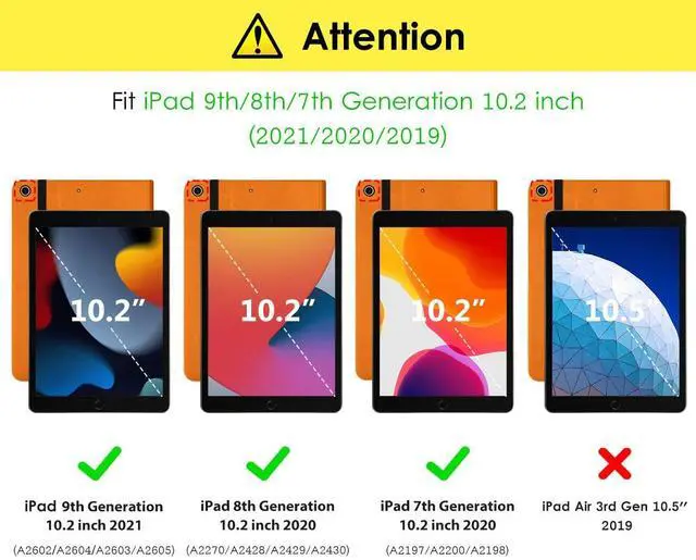 Compatibility - Designed for the Apple iPad 9th/8th/7th generation 10.2" 2021/2020/2019 released(Model Number: A2602/A2604/A2603/A2605/A2270/A2428/A2429/A2430/A2197/A2200/A2198). Not compatible with any other iPad model.