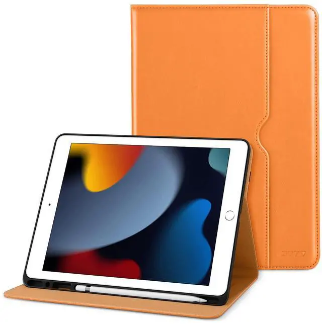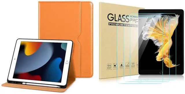 DTTO for iPad 9th/8th/7th Generation 10.2 Inch Case 2021/2020/2019, Premium Leather Business Folio Stand Cover with 3 Pack HD Clear Tempered Glass Screen Protector, Orange